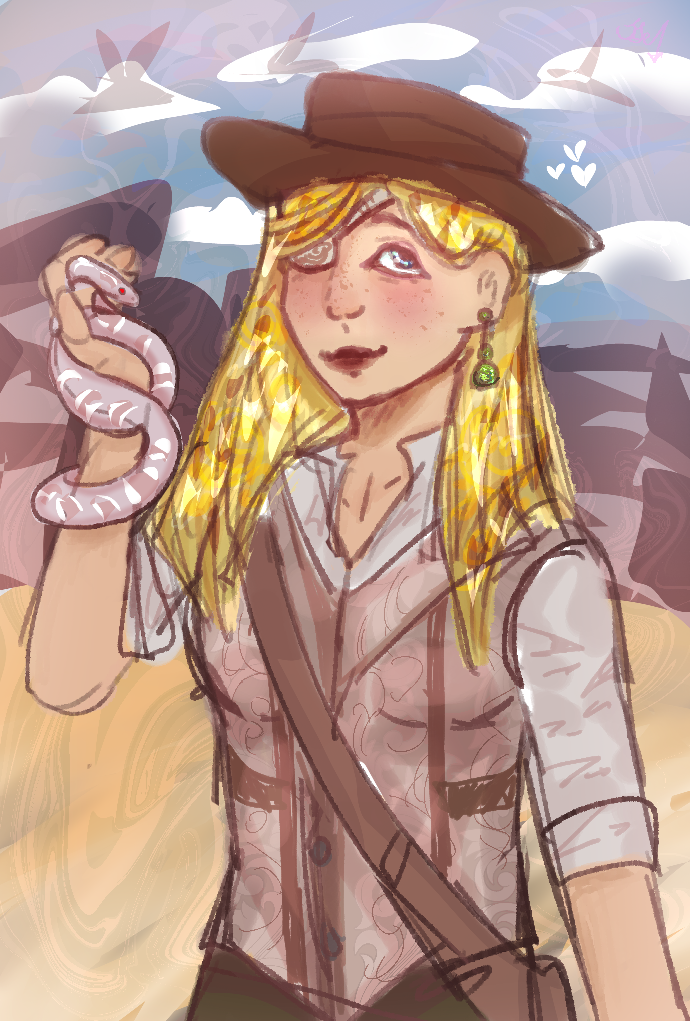 During July Bea also adopted a little corn snake she found nearby Buffalo Creek Ranch, she named it Maizie and keeps it in her camp near Manteca Falls. It was after finding a criminals pair of snakes in Shady Belle that she suddenly felt like having her own. So when she spotted the corn snake she took it in as her own little pet snake. Bea and Maizie get along very well, it didn't take long for Maizie to warm up to Bea.