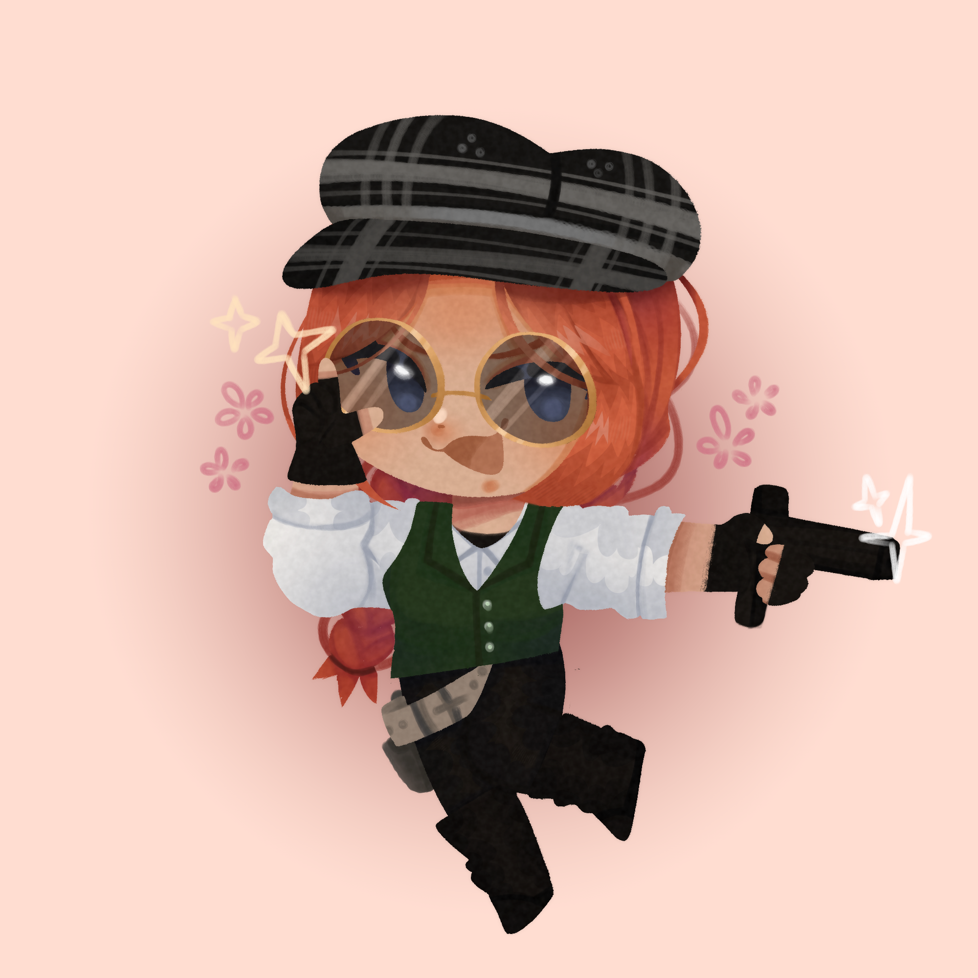 Physically, Zadie has pale skin dotted with freckles and ginger hair that she usually keeps tied back for practicality. Her light brown eyes are sharp and calculating, constantly observing the world around her, usually covered with a pair of glasses so she can see properly. Lean and athletic, she dresses in practical, rugged frontier clothing that allows her to move freely, reflecting her upbringing under the harsh sun and her life on the move.